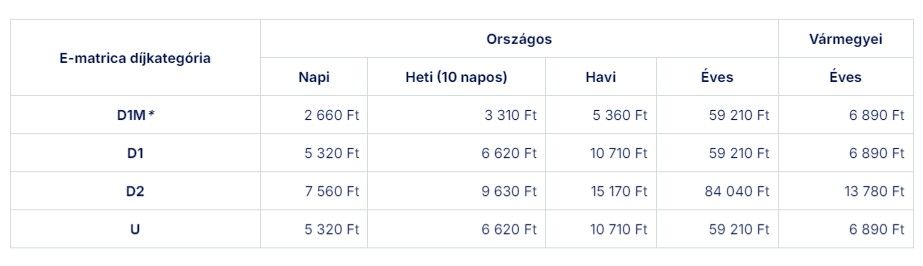 A díjak 3,4 százalékkal lettek magasabbak, így a D1 kategóriában az éves vármegyei matrica 6890 forint, az egynapos jegy 5320 forint, a havi országos bérlet 10710 forint, az éves országos bérlet 59210 forint, a 10 napos országos jegy pedig 6620 forint lett.