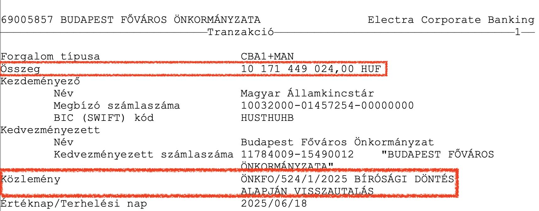 A főpolgármester Facebook-oldalán egy fotó kíséretében jelentette be, hogy a Magyar Államkincstár (MÁK) visszautalta Budapest számlájára azt a 10,2 milliárd forintot, melyet május végén a 2025. májusra, júniusra, júliusra és augusztusra eső szolidaritási adó gyanánt vont le.