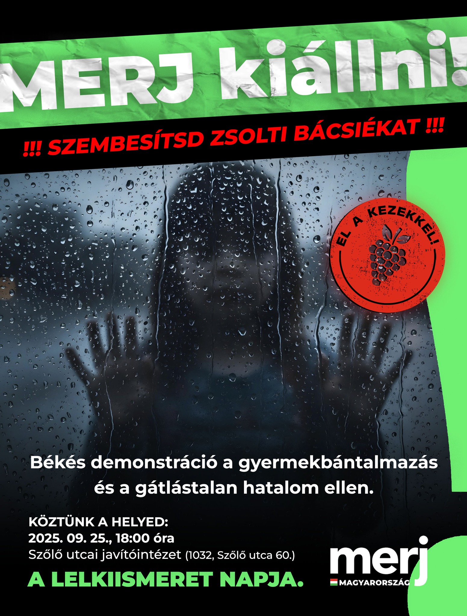 Gaal Gergely új pártja, a MERJ Magyarország nevében csütörtökre tüntetést hirdetett a Szőlő utcai javítóintézethez mert szerinte a lelkiismeret napján mindenkinek a gyermekbántalmazás és a gátlástalan hatalom ellen kell tiltakoznia, mindegy, hogy melyik párthoz tartozik.