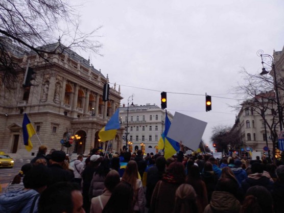 Ukrajna orosz lerohanásának második évfordulóján demonstrálnak civilek az Andrássy úton, szól a "Ruszkik, haza!". Ott van Karácsony Gergely és David Pressman is.