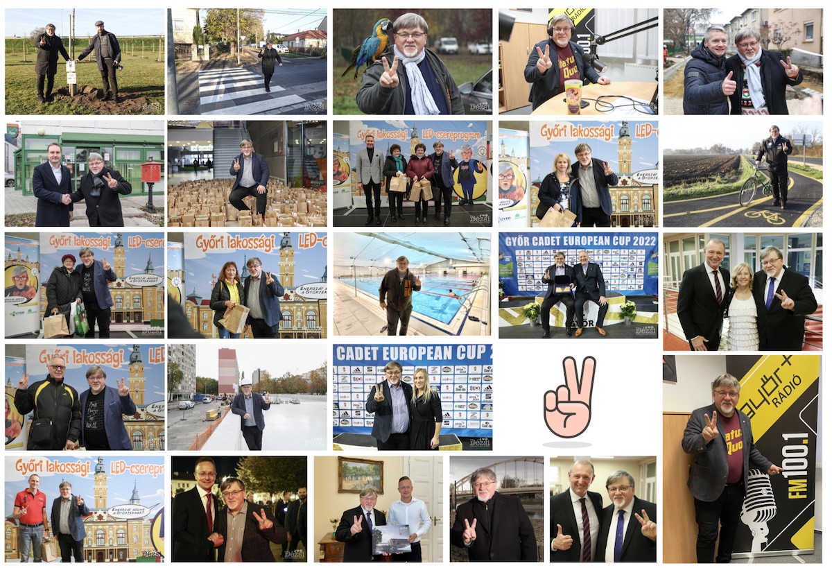 A szerkesztő megjegyzése: A győri polgármester Facebook-oldalán egyébként csak egy évre visszamenőleg 141 ilyen V betűt formáló képet találtunk Dézsi Csaba Andrásról, melyek 10 másodpercben megtekinthetők a cikk közepén található videóban. (Tovább nem volt már energiánk görgetni a múltba.)
