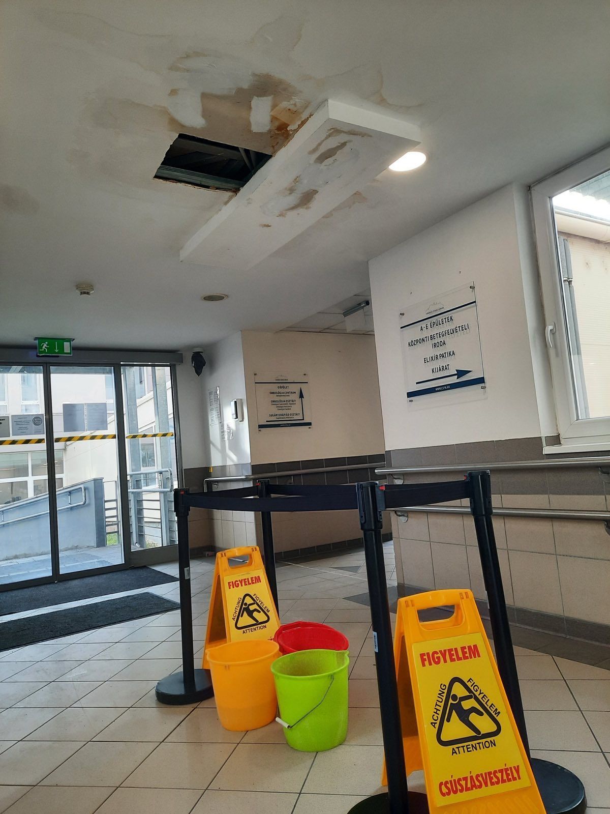 Nézek egy képet, a veszprémi kórházban készült, a csöpögő plafonról. A megoldás szakszerű, a megbomlott álmennyezet alá gondosan vödröket applikáltak, és körbe is kordonozták, hogy a veszélyeztetett recepció körül nehogy újabb súlyos sérüléseket szerezzenek a betegek. A helyzet napok óta tart, aztán ki tudja, mikor lesz megoldás, az is megeshet, hogy a vödrök és a Figyelem! Csúszásveszély! feliratok beépülnek a környezetbe. Kedves hagyománnyá válnak, rájön mindenki arra, hogy ez éppen így a legjobb, és mégsem dől rá senkire semmi.